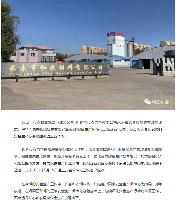長(zhǎng)春市和農(nóng)飼料有限公司榮獲“安全生產(chǎn)標(biāo)準(zhǔn)化三級(jí)企業(yè)”證書